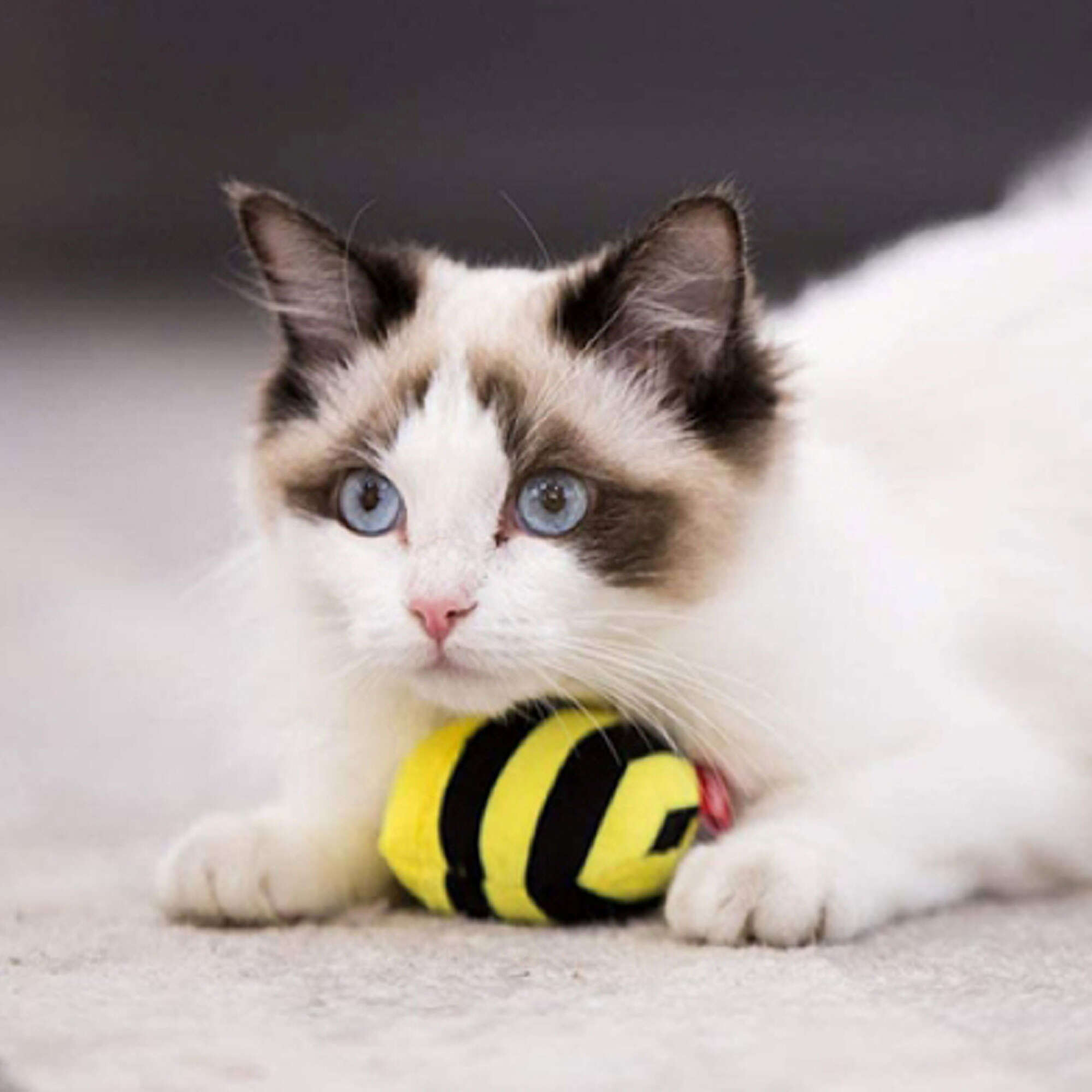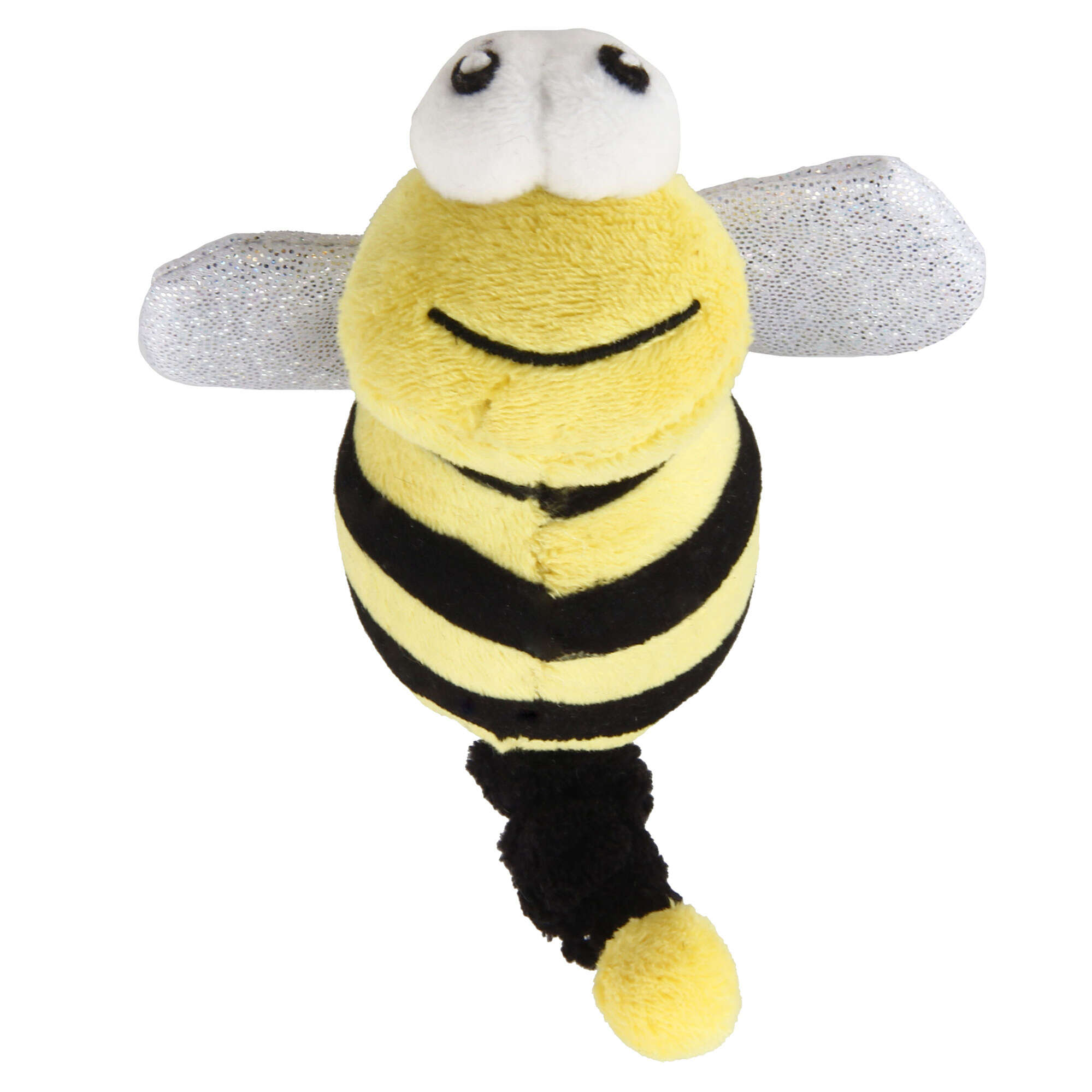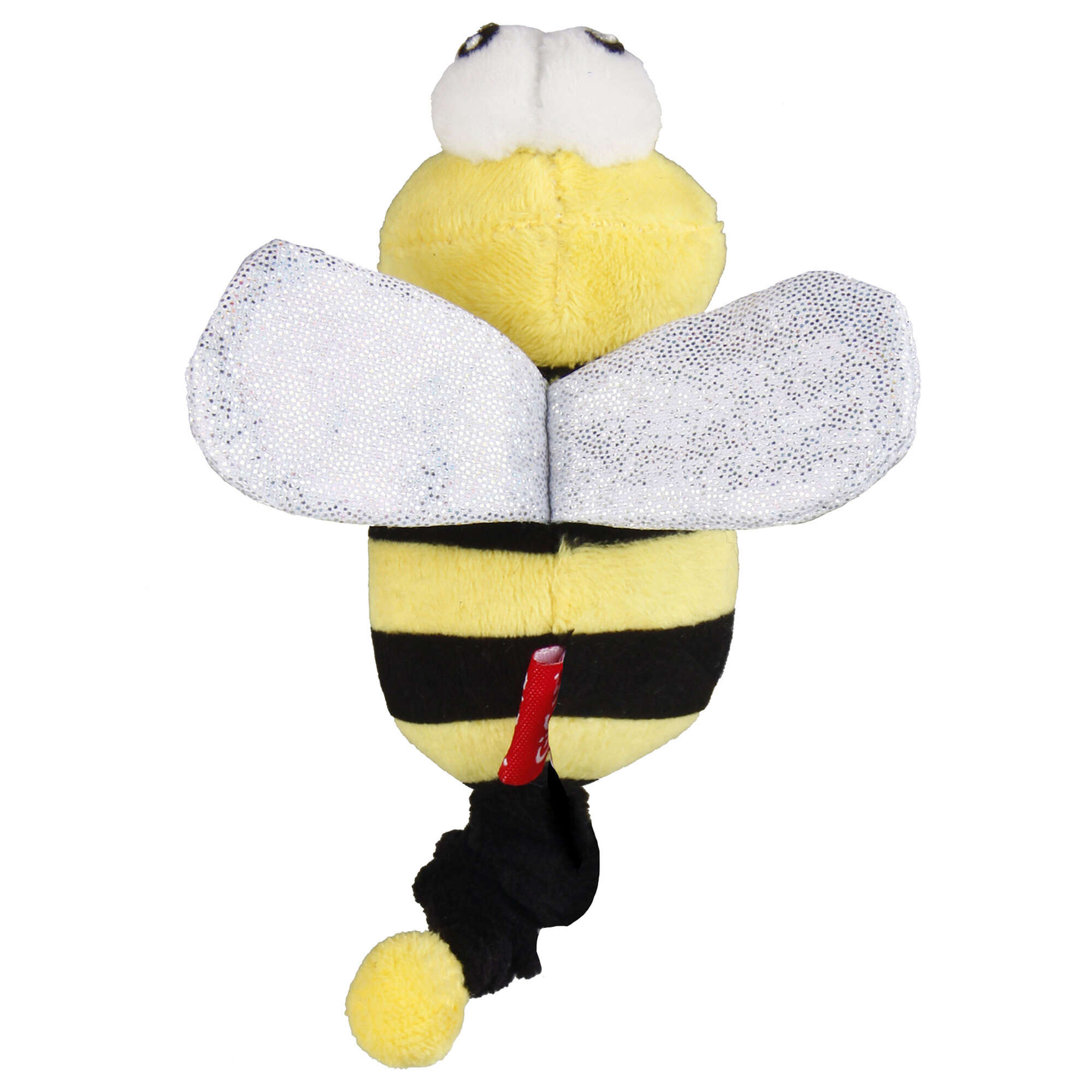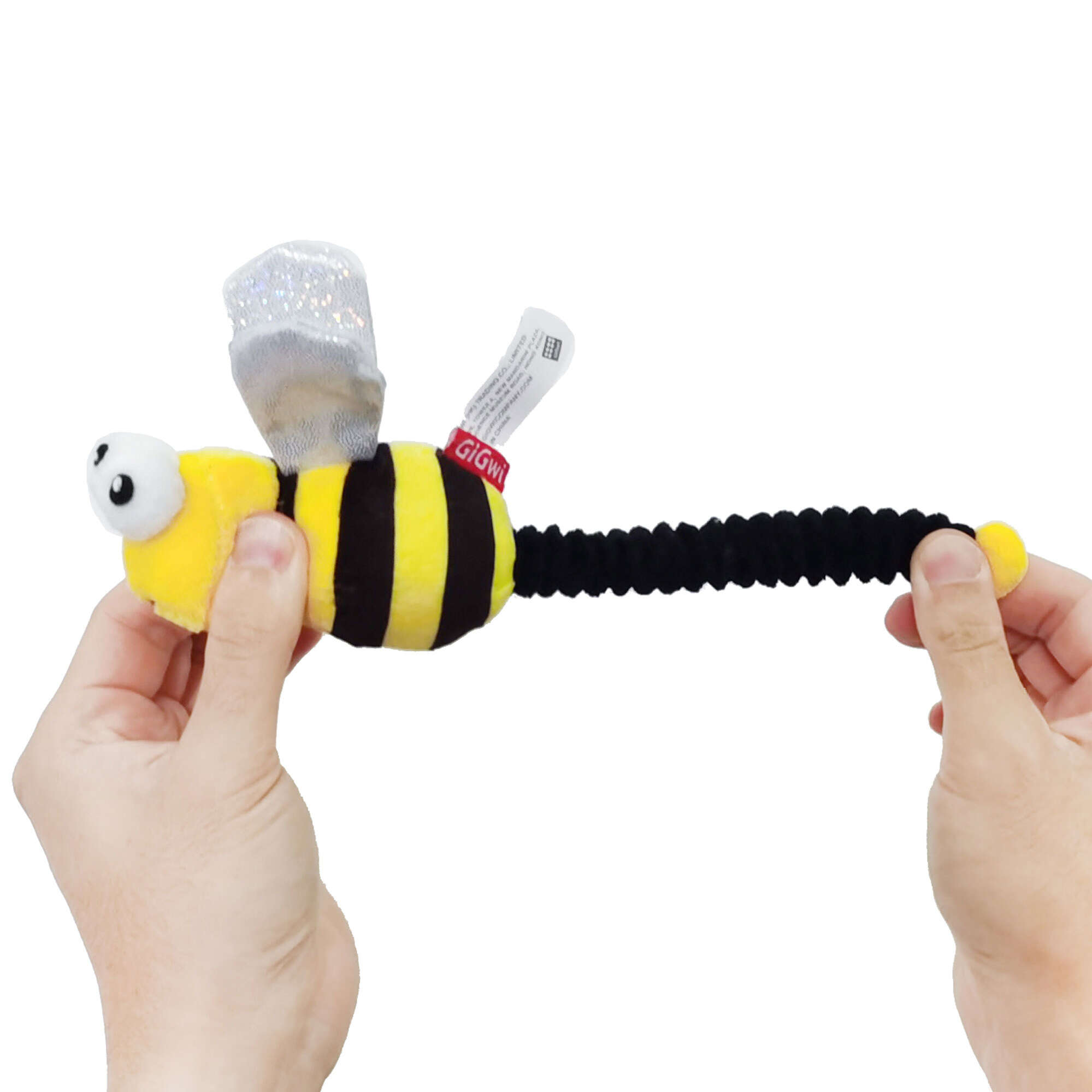 Su diseño en forma de abeja, fabricado en tejido suave y mullido, incorpora un mecanismo interno que se activa al tirar de la cola, generando un movimiento vibrante y realista que imita el comportamiento de un insecto. Además, sus alas con efecto crujiente añaden un estímulo sonoro adicional que incentiva la interacción.