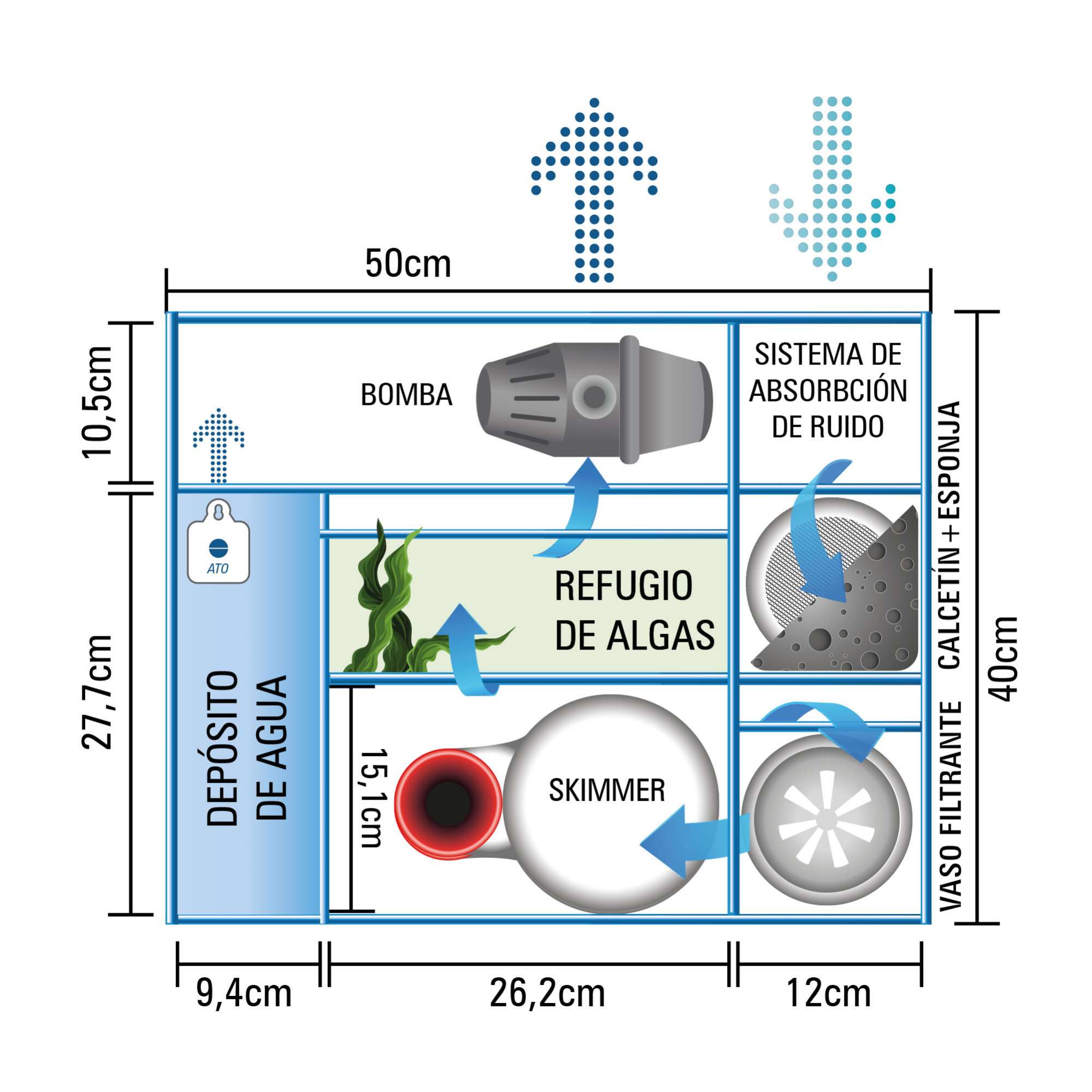 El sump ha sido diseñado para aprovechar al máximo el espacio, una pequeña urna compacta divida en diversos compartimentos con los últimos avances en filtración y reducción de ruidos: