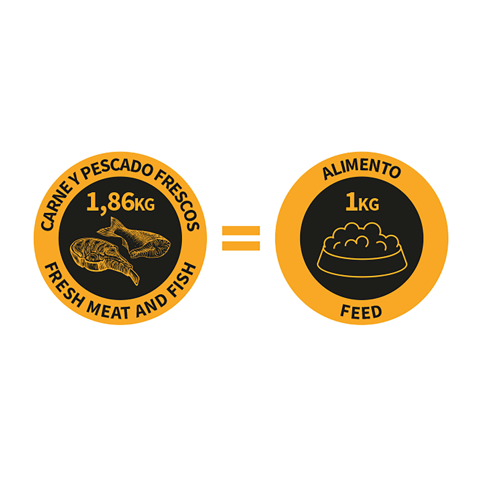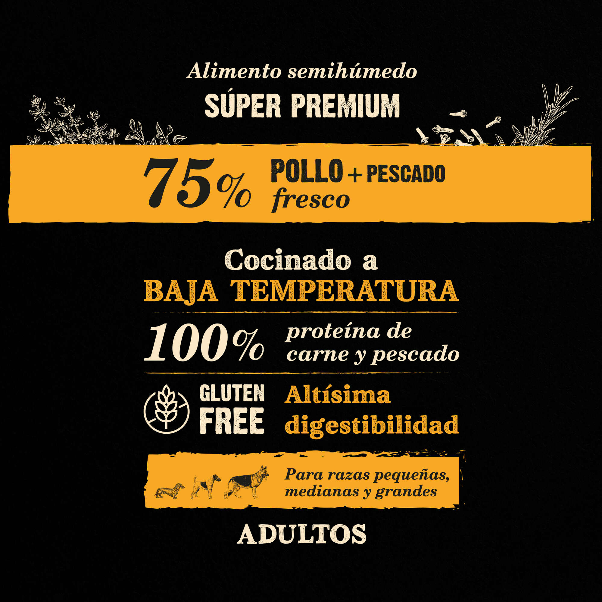 Composición: 55% pollo fresco, 20% pescado fresco (alacha (Sardinella aurita), caballa (Scomber scombrus), jurel (Trachurus spp.), sardina (Sardina pilchardus)), almidón hidrolizado, tocoferoles de aceites vegetales, extracto de romero, huevo deshidratado, aceite esencial de orégano, tomillo, clavo, romero, canela Ceylán. ADITIVOS/kg: Vitamina A (3a672a): 22.726 UI, vitamina D3 (3a671): 1.450 UI, vitamina E (3a700): 454 UI, zinc (3b603): 100 mg, hierro (3b103): 72 mg, manganeso (3b503): 36 mg, cobre (3b405): 7,2 mg, yodo (3b201): 1,27 mg.