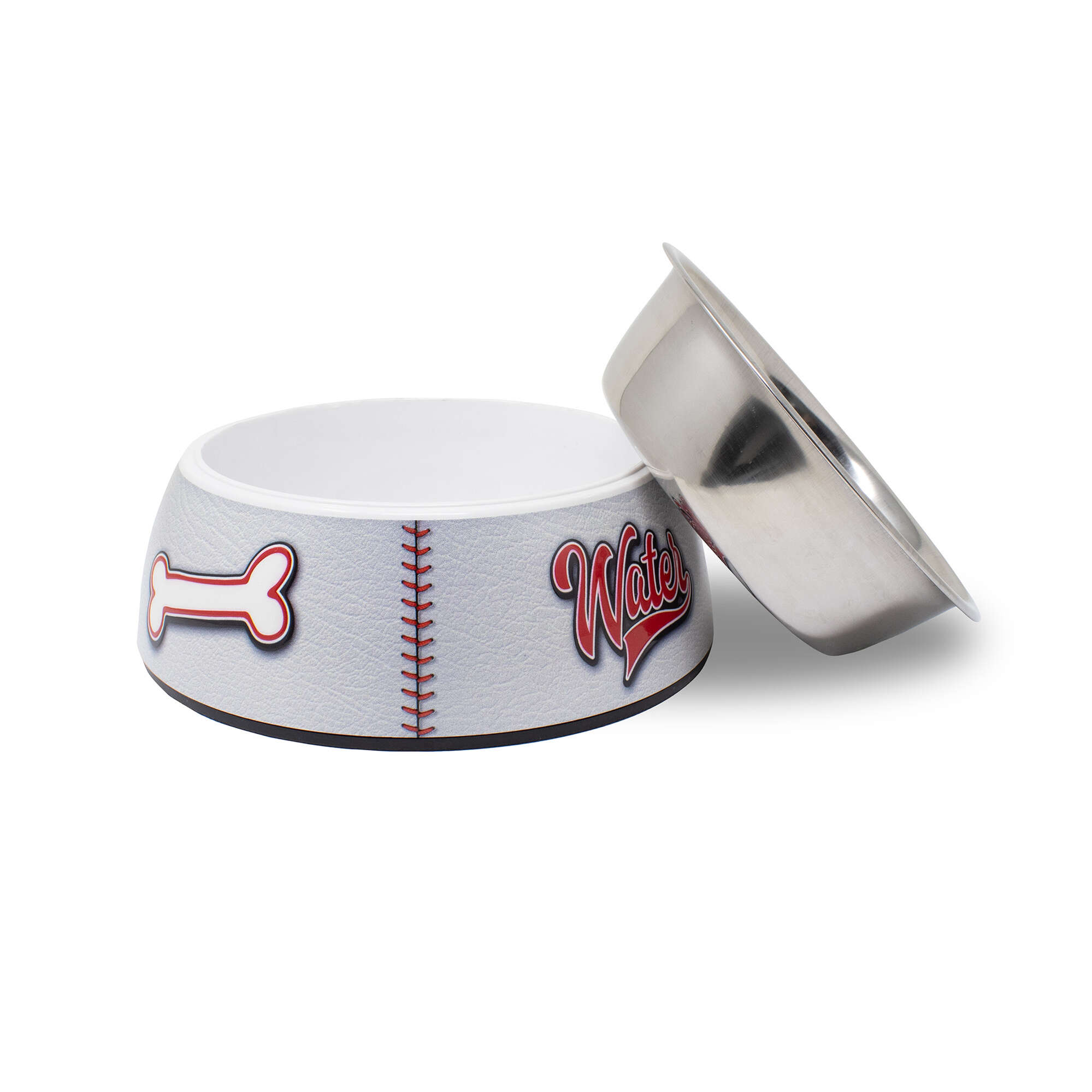 Bowl de acero inoxidable Food de XT-DOG, su exterior está decorado con temática de béisbol, imitando una pelota con sus costuras y colores. Además, cuenta con una base antideslizante y diseño especial antivuelco que asegura una mayor estabilidad durante su uso.