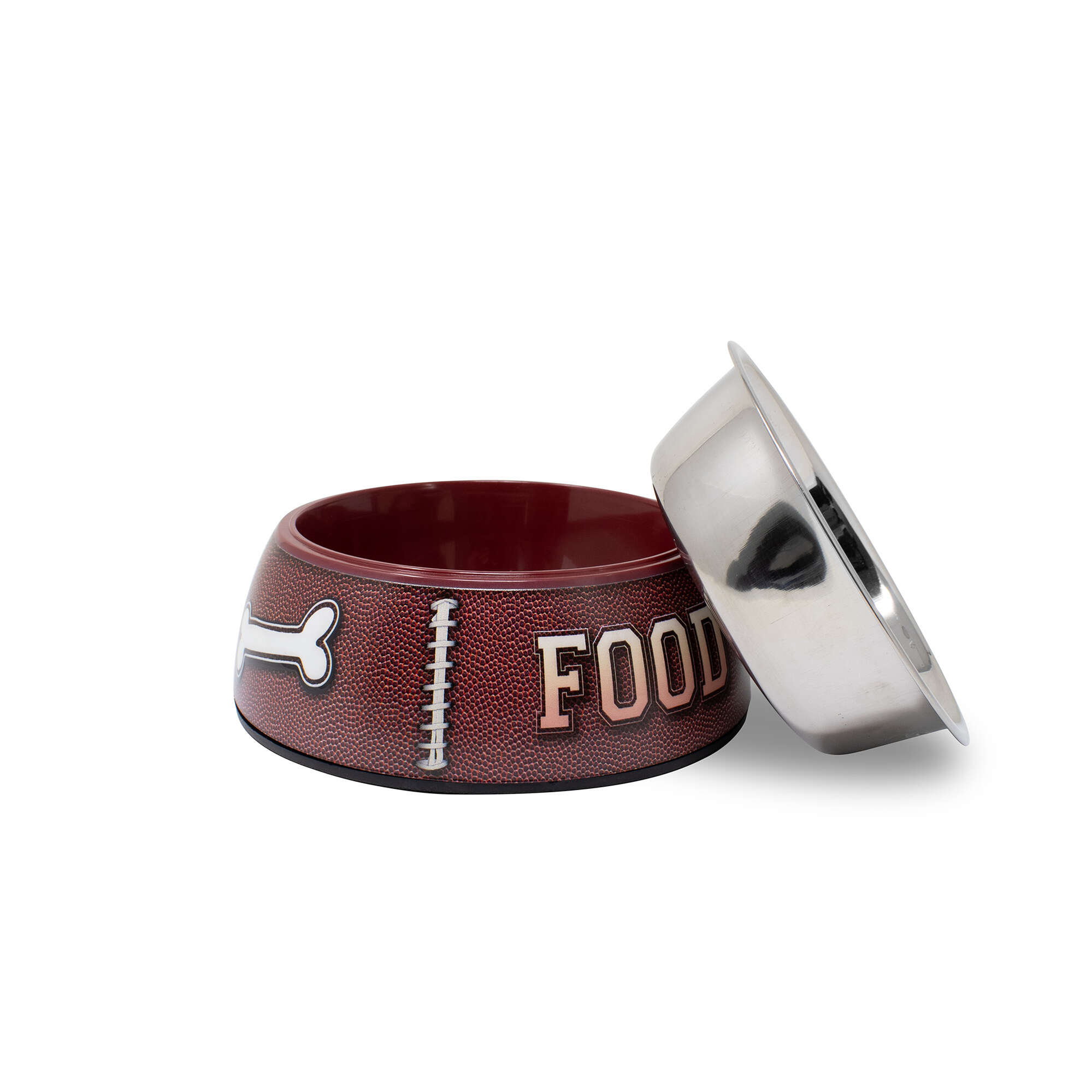 Bowl de acero inoxidable WATER de Premier DOG, su exterior está decorado con temática de rugby, imitando una pelota con sus costuras y colores. Además, cuenta con una base antideslizante y diseño especial antivuelco que asegura una mayor estabilidad durante su uso.