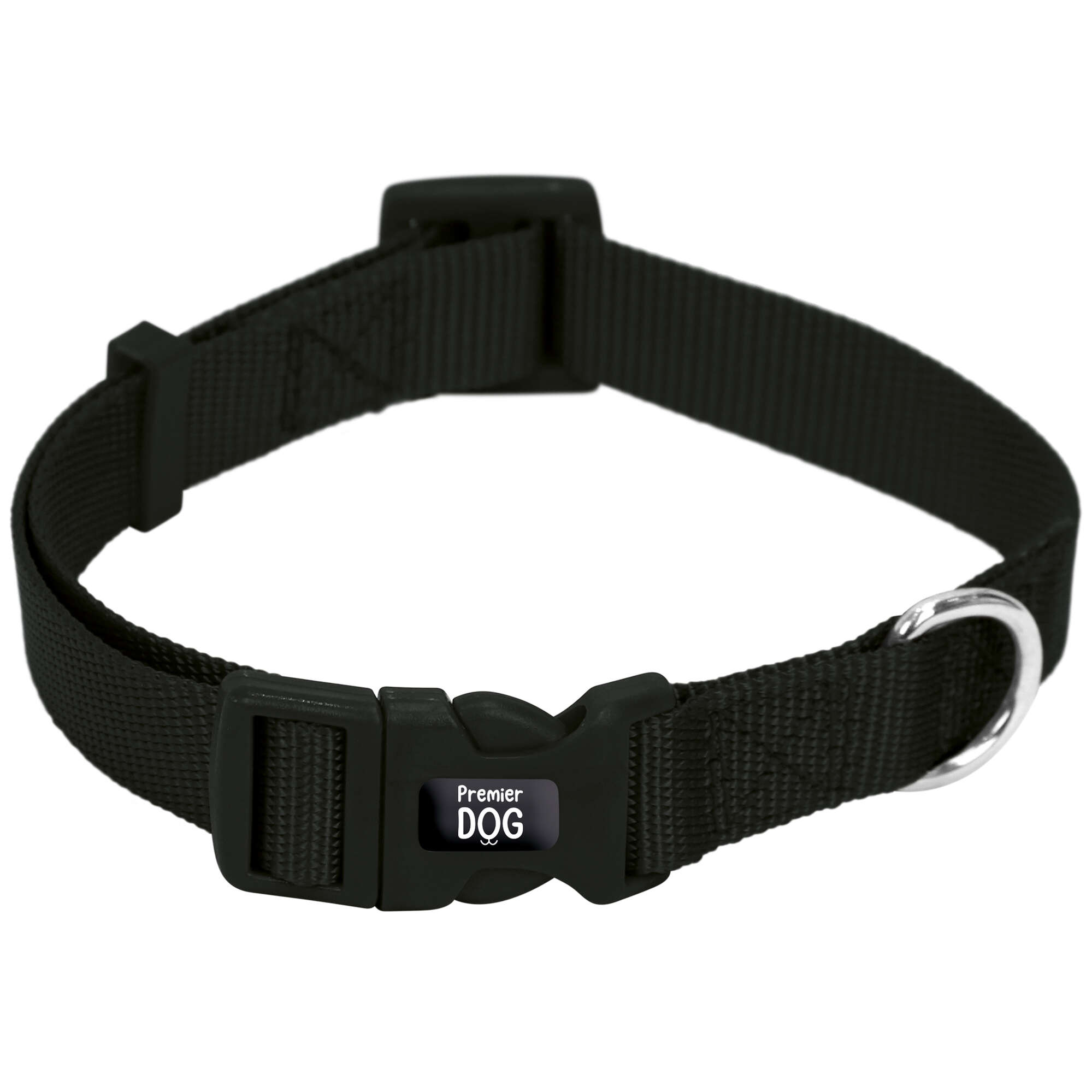 Collar para perros Premier DOG, fabricado de nylon de gran calidad para resistir el uso diario. Diseño clásico en color negro que puede combinarse con el arnés y collar de la misma línea y color. Anilla de sujeción para enganche de correa.