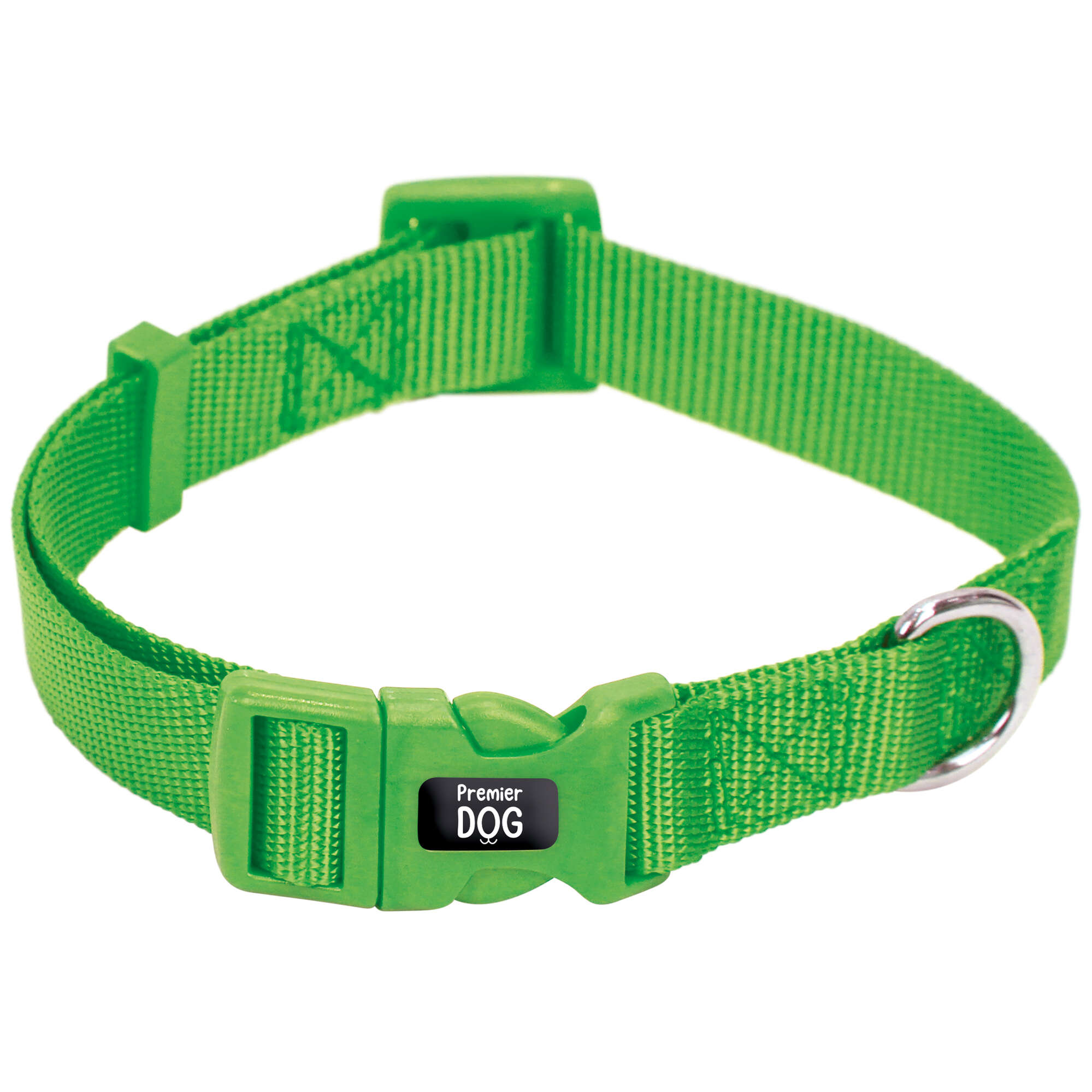 Collar para perros de Premier DOG, diseño clásico de color verde y fabricado de nylon súper resistente para el uso diario. Disponible arnés y correa de la misma línea y color. Anilla de sujeción para el enganche de la correa.