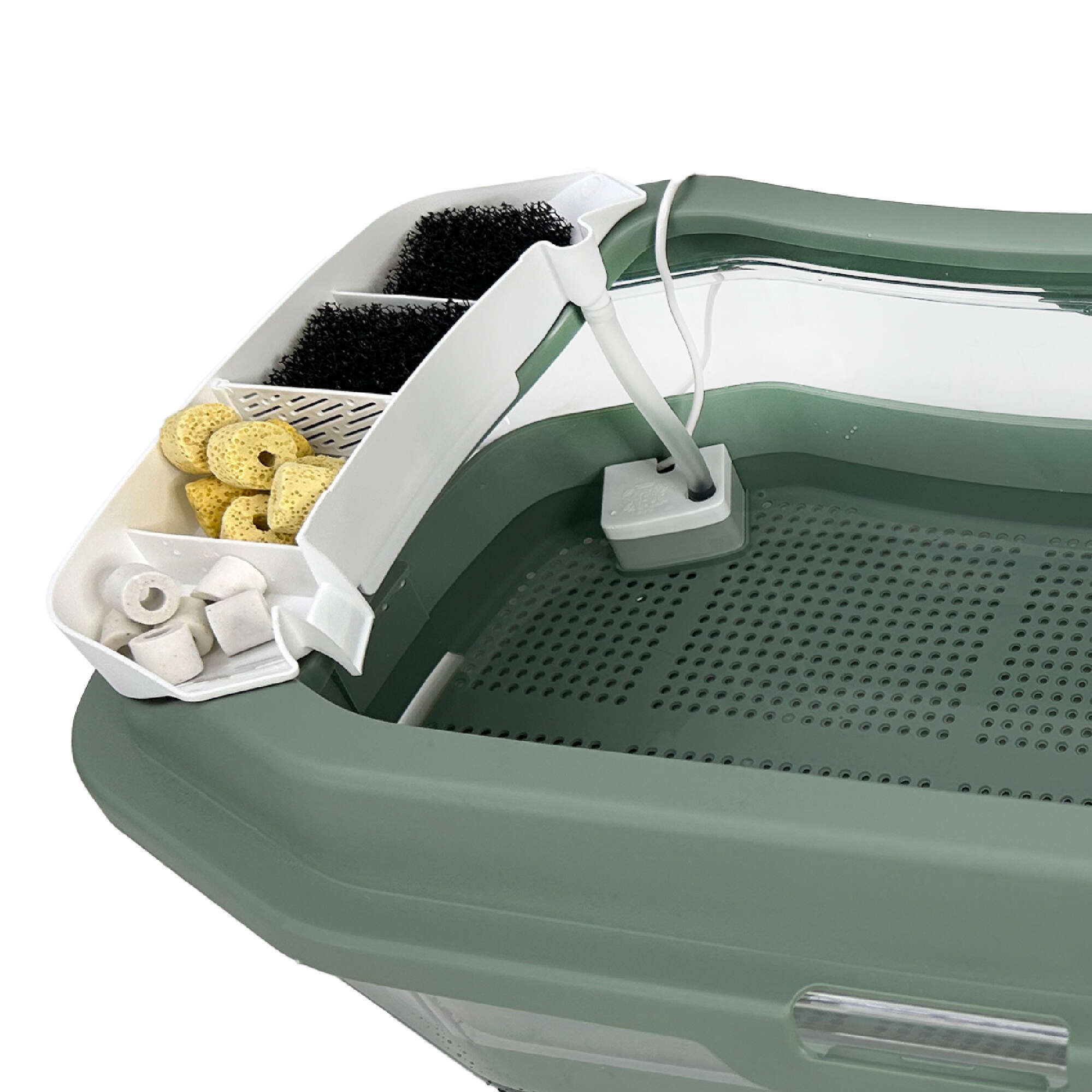 El filtro colgante EASY CLEAN es un sistema completo diseñado específicamente para integrarse con las tortugueras de la misma línea, garantizando un ambiente limpio para tus tortugas.