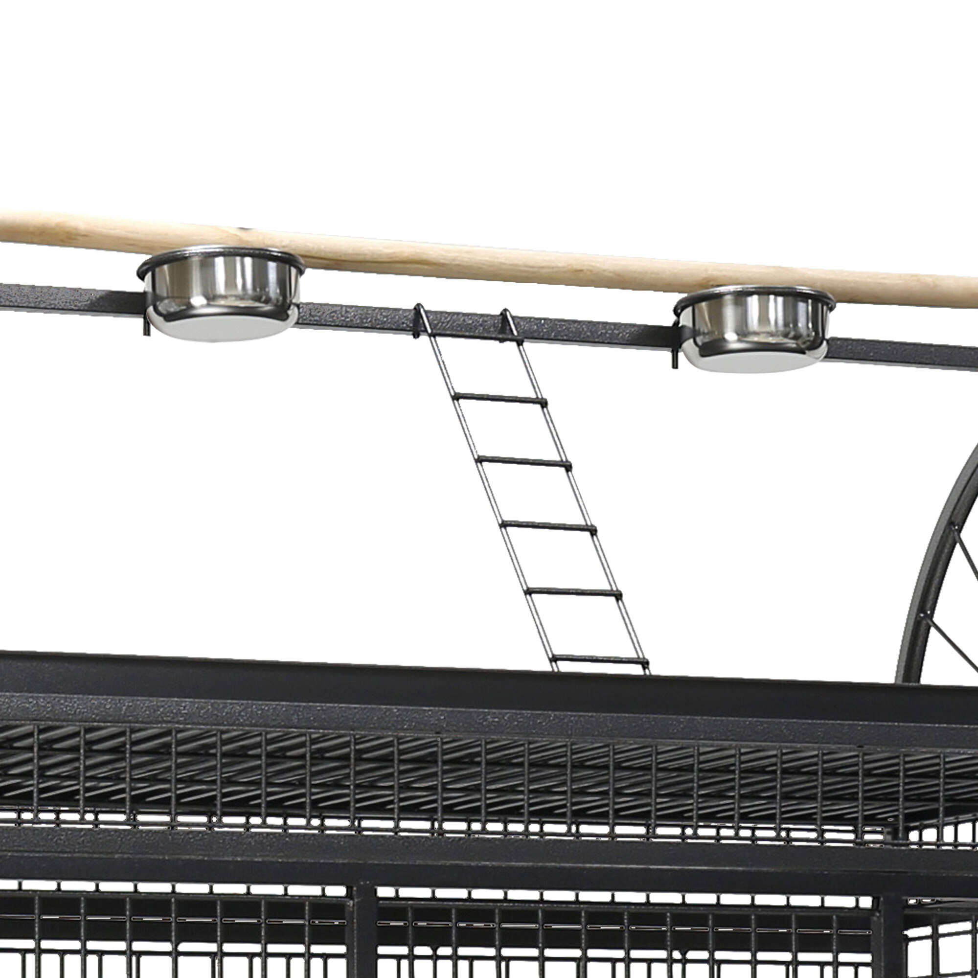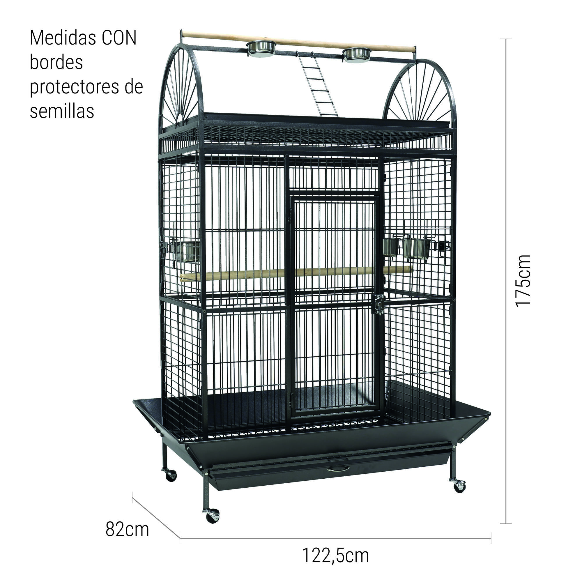 Para mayor comodidad de manejo incluye ruedas en la parte inferior, una zona de juego en la parte superior con dos comederos, muy útil para ponerle premios y golosinas así como comida y que este salga de la jaula sintiéndose seguro, además de una gran percha donde descansar.