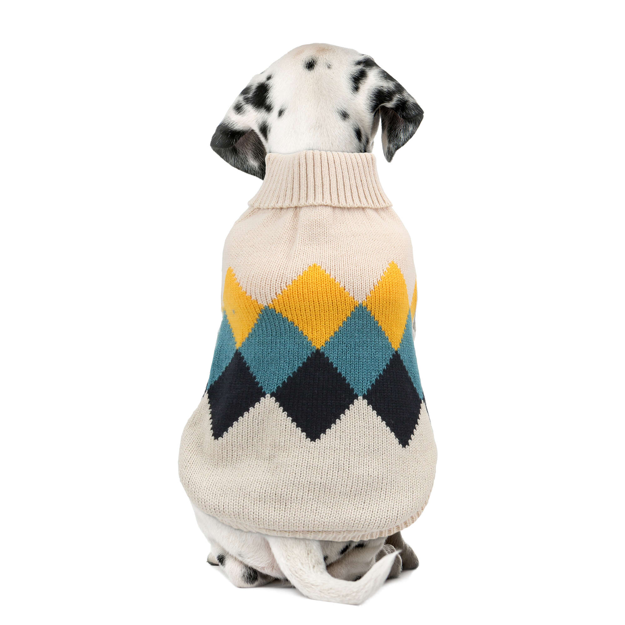 Jersey de punto para perros ALPHA DOG, con diseño clásico en color beige y rombos multicolor. Confeccionado con materiales de calidad que permiten lavarlo a máquina para una limpieza sencilla. Suave y cálido, mantiene a tu mascota abrigada en días fríos o lluviosos, ideal tanto para usar en casa como en paseos al aire libre.
