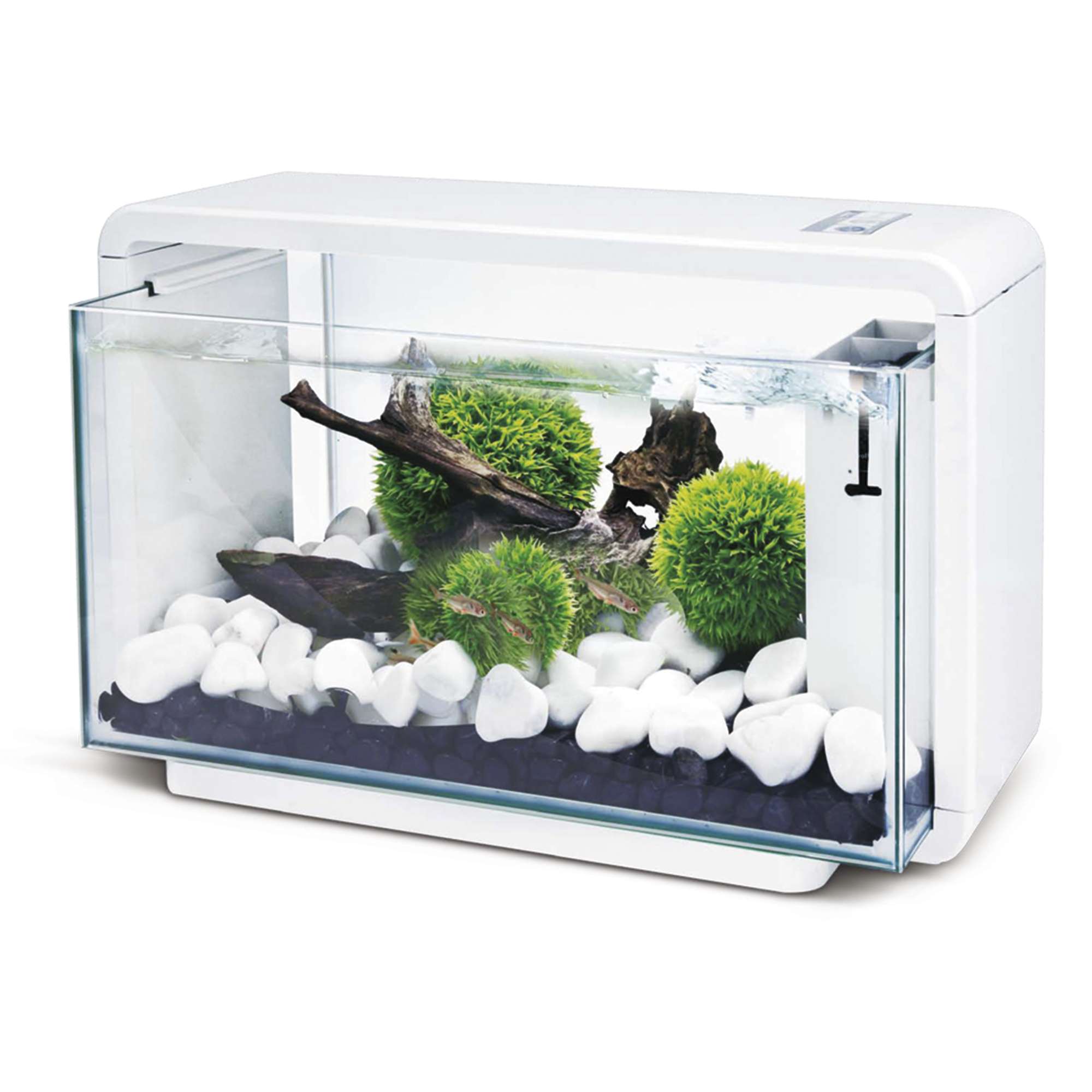 Nano acuario con un diseño de líneas simples y muy elegante. Tiene un compartimento para ocultar el filtro y termocalentador, cuatro intensidades para la luz diurna y dos para la nocturna. El encendido / apagado es táctil. KIT BASE incluye*: filtro interior.