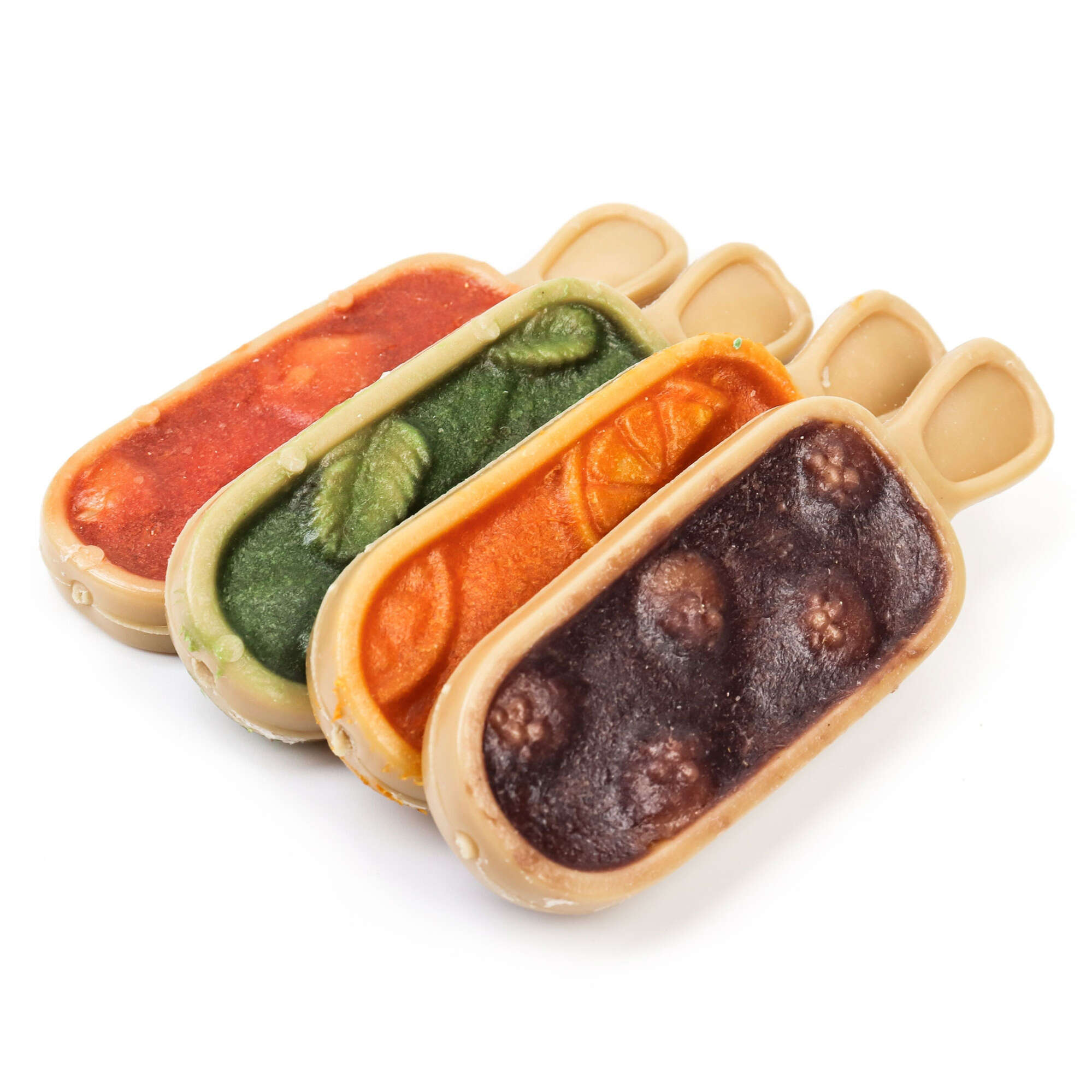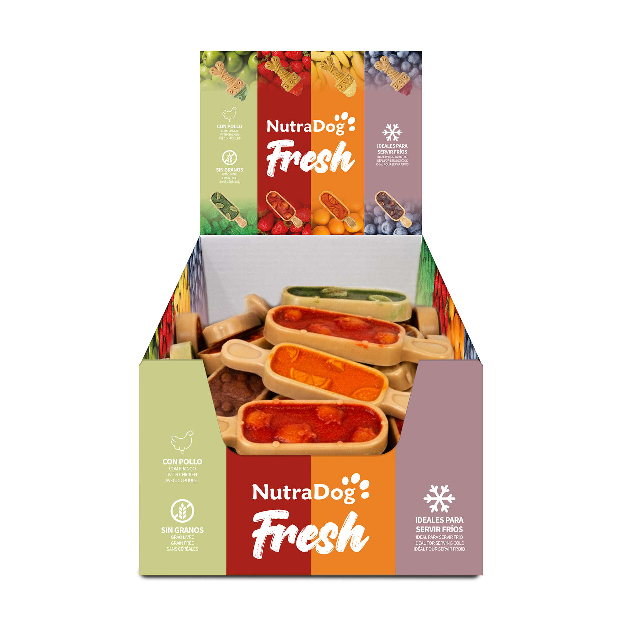 Deliciosas paletas heladas de NutraDog Fresh para perros en cuatro sabores refrescantes y naturales, ideales como recompensa para consentir a tu mascota. Cada paleta está elaborada con ingredientes seleccionados que la convierten en un snack saludable.