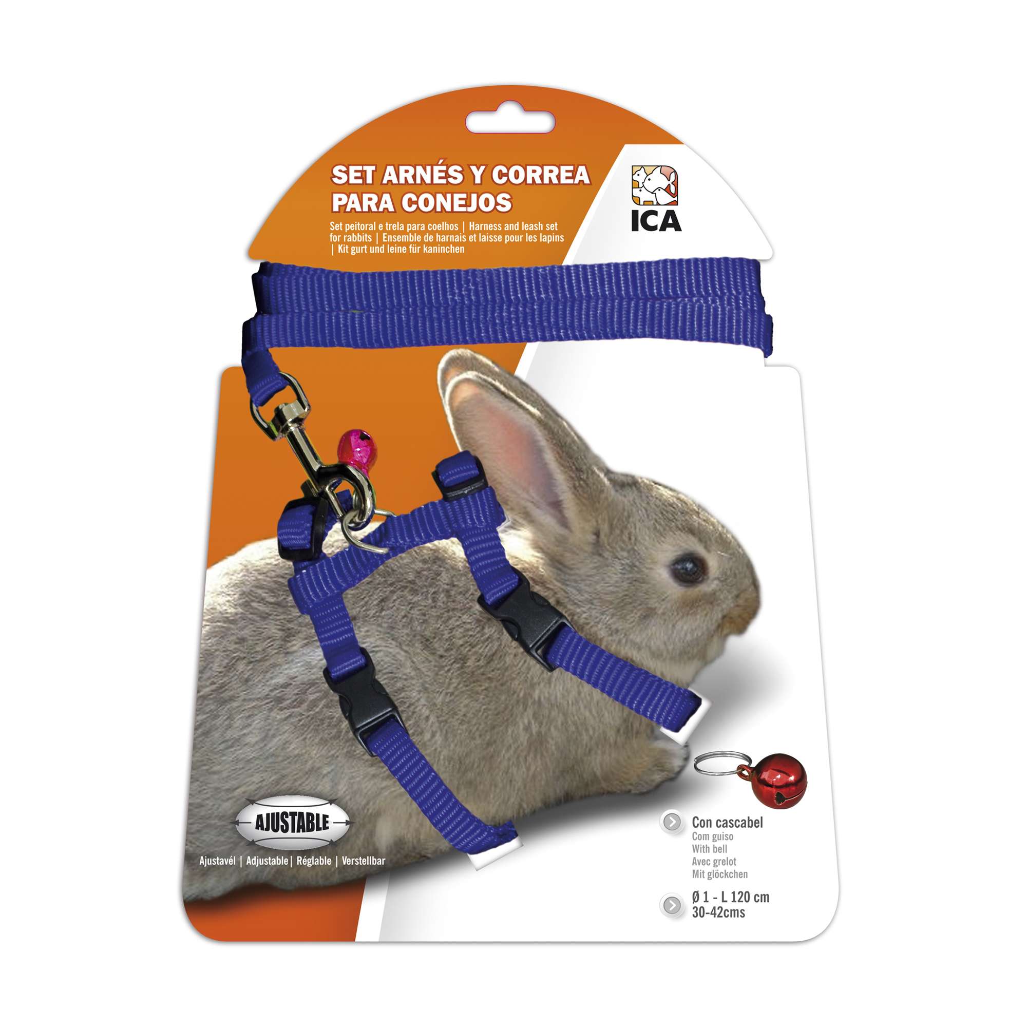 Set arnés y correas de nylon para conejos, fabricados con materiales de alta calidad. Incluye cascabel y es ajustable. Disponible en varios colores.