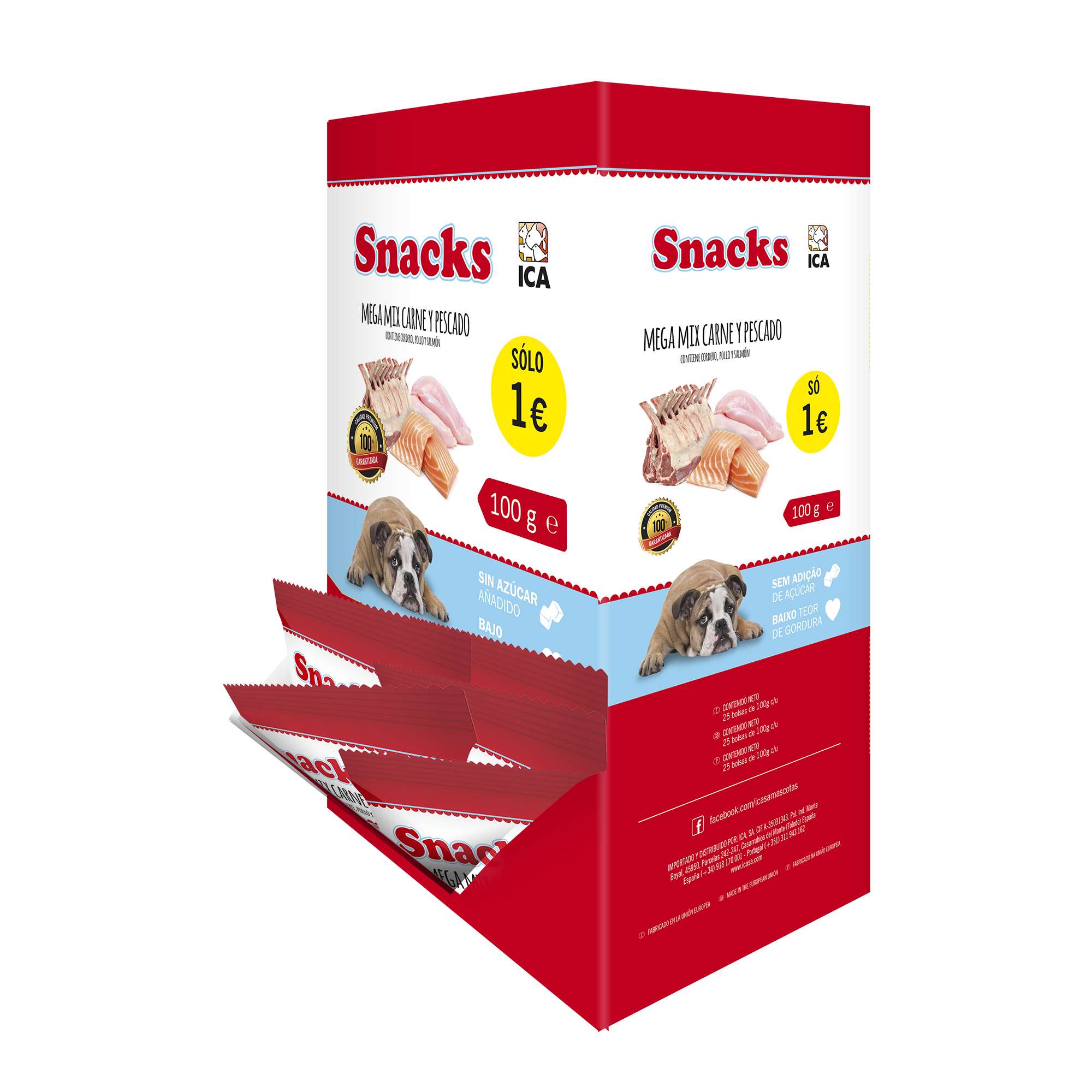 Snacks Mega Mix de Carne y Pescado. Es el complemento alimenticio ideal para sus mascotas. Sin azúcares añadidos y bajo contenido en grasas.