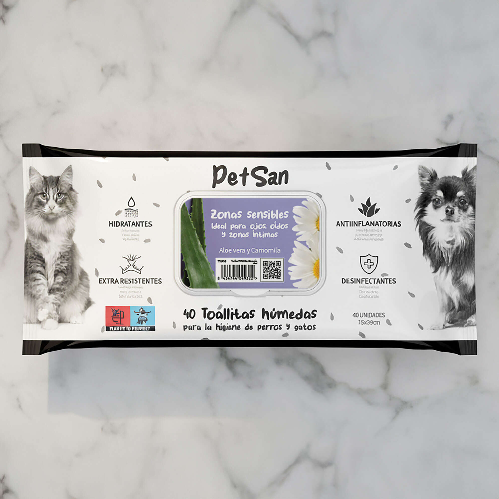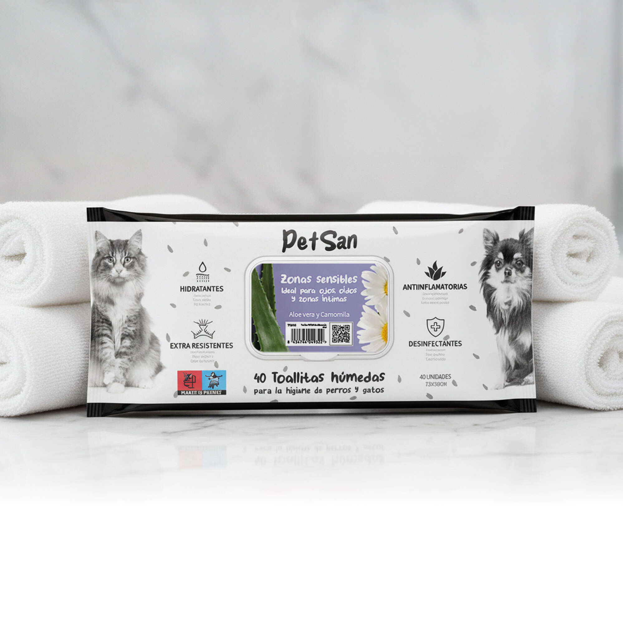 Toallitas húmedas con aloe vera y camomila PetSan para perros y gatos, ideales para la limpieza diaria. Su fórmula con aloe vera y camomila las hace perfectas para el cuidado de zonas sensibles como ojos, oídos y zonas íntimas.