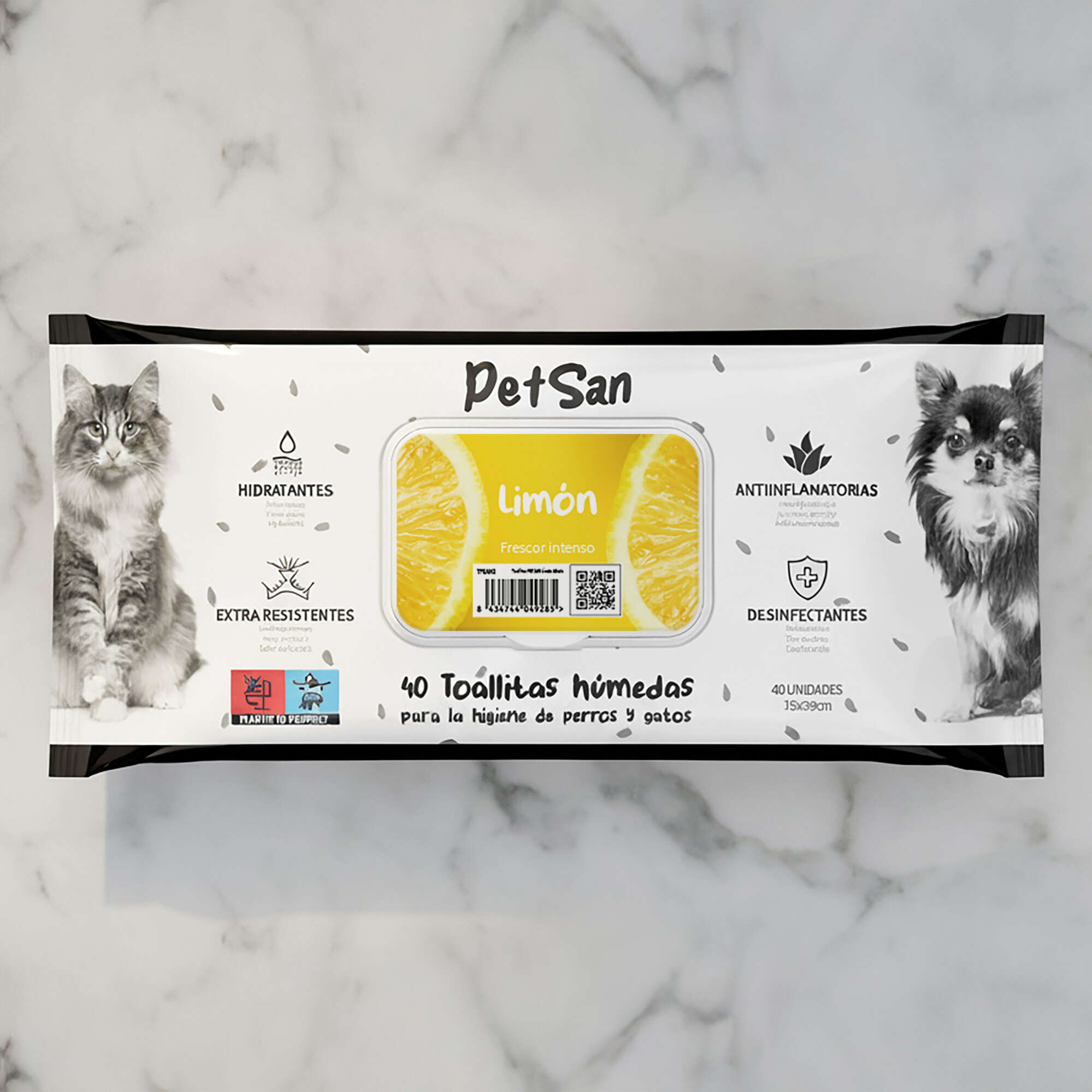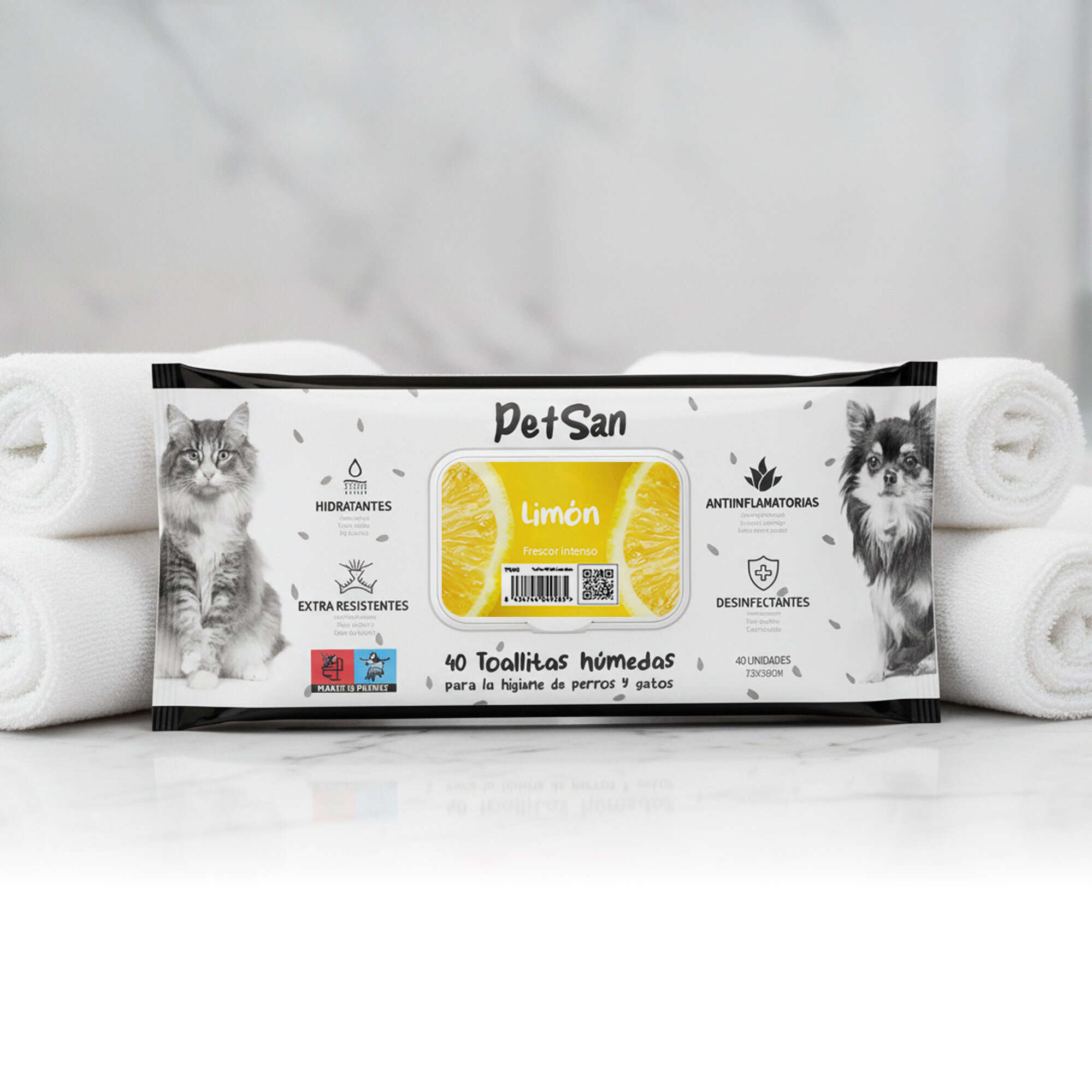 Toallitas húmedas con aroma a limón PetSan para perros y gatos, ideales para la limpieza diaria. Su fórmula respetuosa las hace perfectas para el cuidado del pelaje, patas y otras zonas. Su agradable aroma a limón transmiten un frescor intenso que envuelve a tu mascota .
