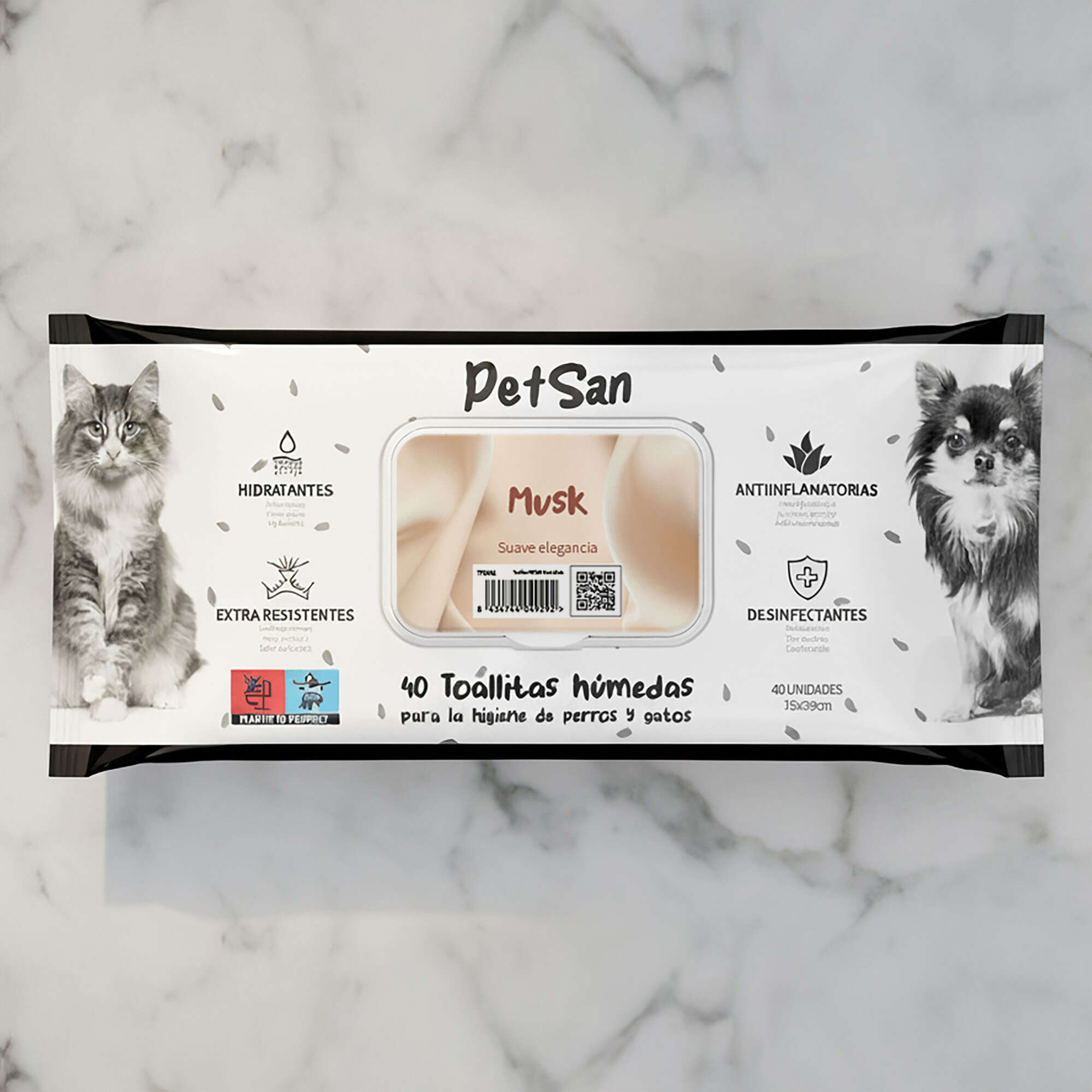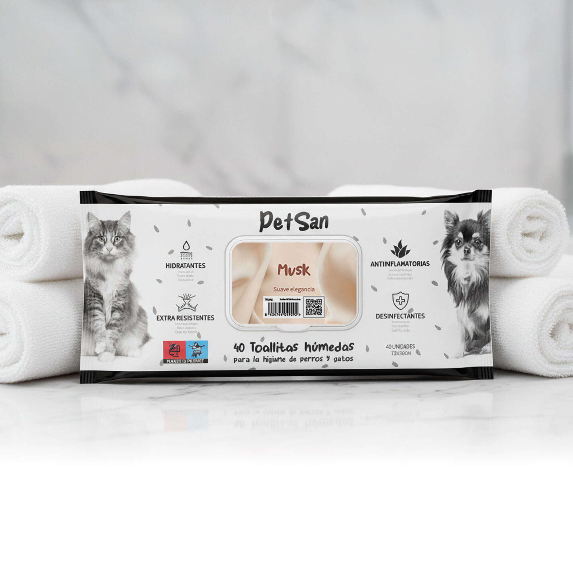 Toallitas húmedas con aroma a musk PetSan para perros y gatos, ideales para la limpieza diaria. Su fórmula respetuosa las hace perfectas para el cuidado del pelaje, patas y otras zonas delicadas. Su agradable aroma a musk transmiten una suave elegancia que envuelve a tu mascota .