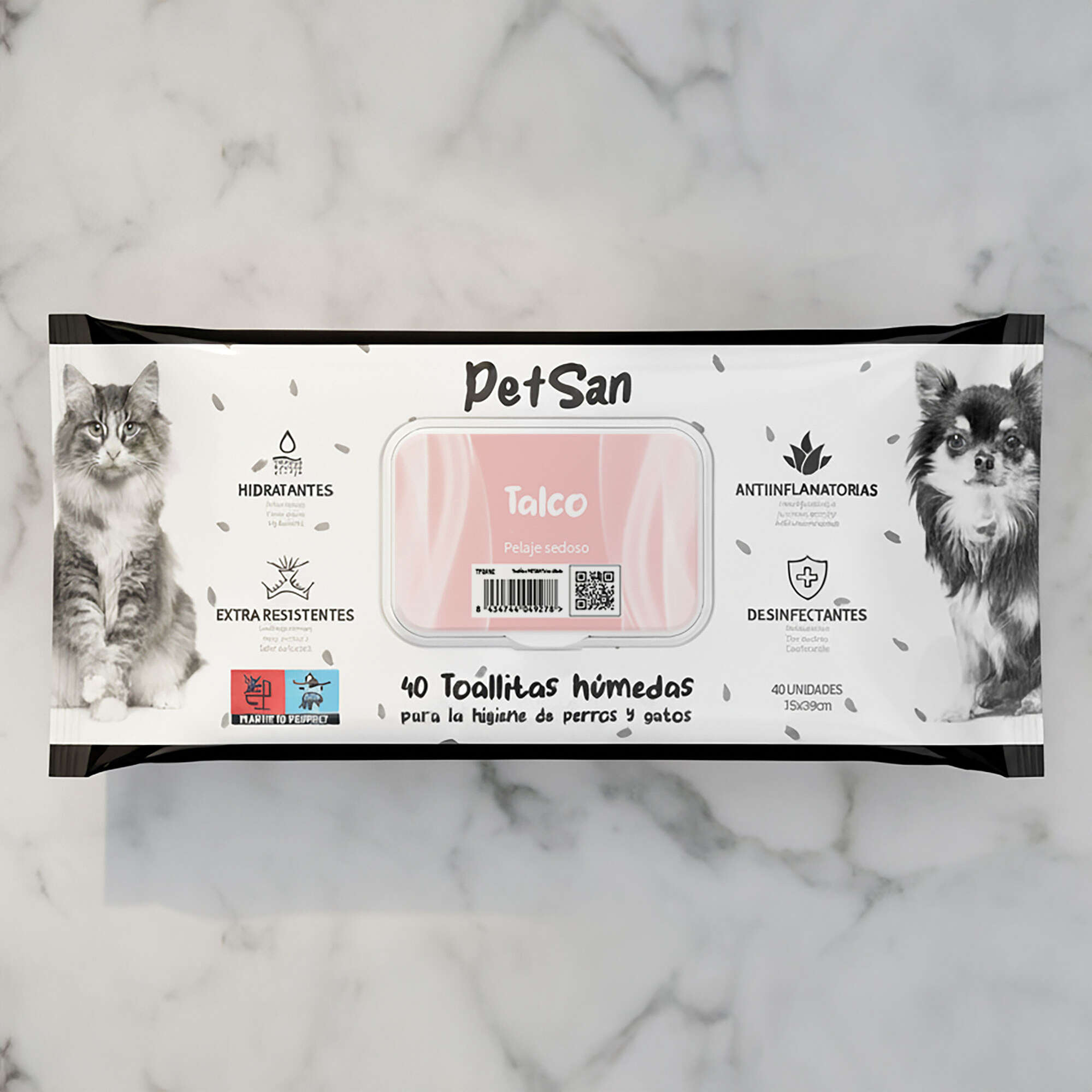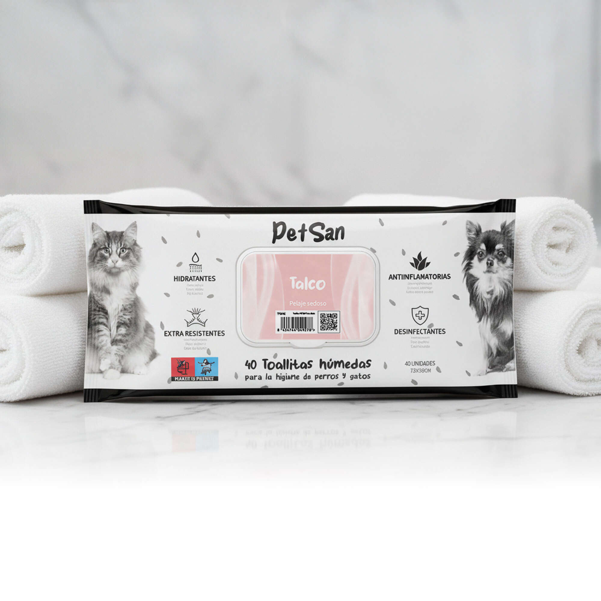 Toallitas húmedas con aroma a talco PetSan para perros y gatos, ideales para la limpieza diaria. Su fórmula respetuosa las hace perfectas para el cuidado del pelaje, patas y otras zonas delicadas. Su agradable aroma a talco dejan un pelaje suave y sedoso a tu mascota.
