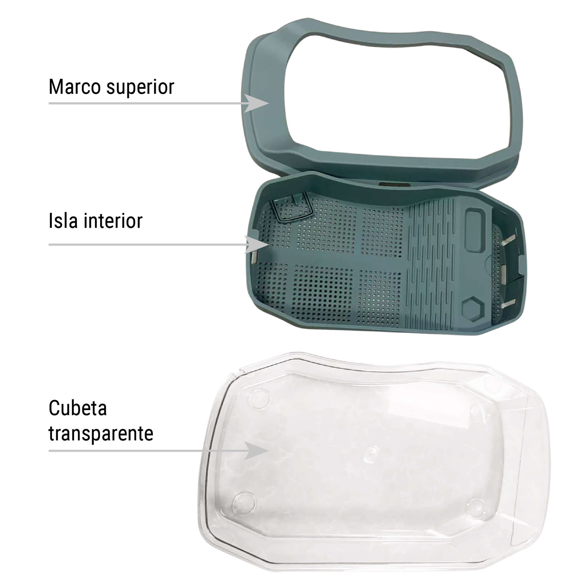 - Diseño modular: Compuesta por una cubeta transparente, una cesta de drenaje (isla interior) y un marco superior ancho diseñado específicamente para evitar fugas.
